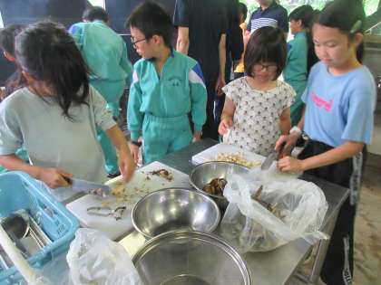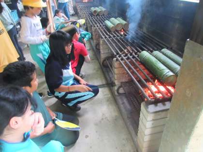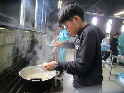 野外炊事の様子です。豚汁と竹飯を作りました。