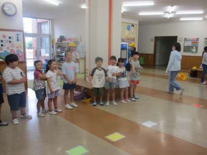 音楽では、「アイアイ」の曲を楽しく歌いました。2つのグループに分かれて、「アイアイ」「アイアイ」と呼びかけ合いながら歌いました。