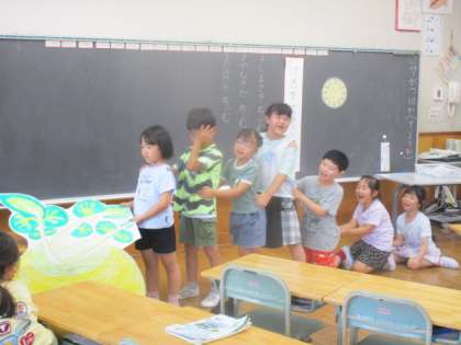 国語の時間には、グループごとに「おおきなかぶ」の音読劇を発表しました。子供たちなりに、一生懸命かぶを引く様子やかぶが抜けて嬉しい様子を音読で表現していました。
