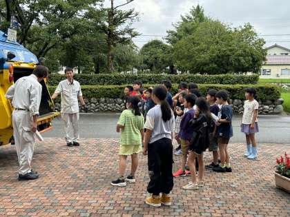 産業廃棄物対策課の方を講師にお招きし、座学とパッカー車見学を行いました。社会科の学習で学んだことについて、さらにくわしく学ぶことができました。ありがとうございました。