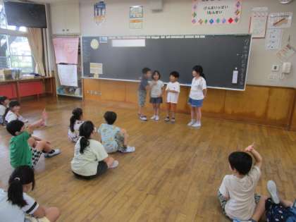係ごとに出し物を発表しました。だじゃれ、ダンス、クイズの発表、また、みんなでおにごっこを楽しみました。
