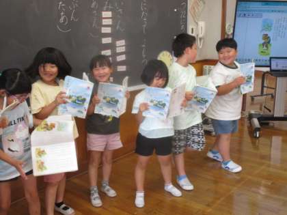 国語「おむすびころりん」の学習のまとめとして、ナレーター、おじいさん、ねずみの中からやりたい役を決め、役になりきって音読をしました。音読の様子を動画で撮影し、自分たちの音読を見てみました。友達のよいところをたくさん見付けることができました。