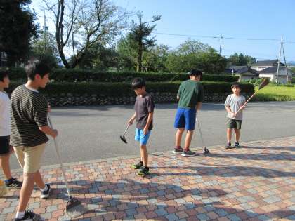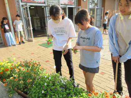 6年生や委員会が中心となって草むしりやあいさつをしたり、玄関前の掃除や花を花瓶に入れて校内に飾ったりするなど、一人一人が朝活動に取り組んでいます。