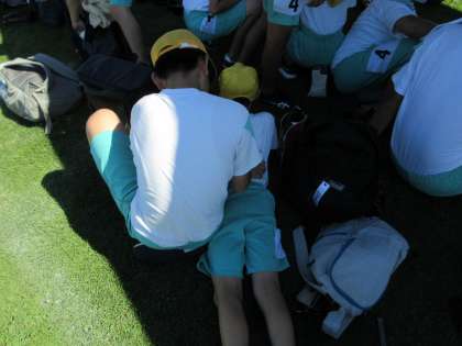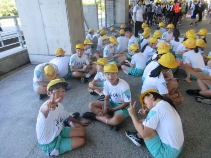 朝早くから登校し、競技場に向かった子供たちです。他の学校の6年生と楽しそうに交流したり、マッサージをして競技に備えたりしていました。