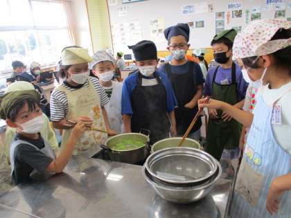 先日収穫した枝豆をみんなで塩茹でにして食べました。調理の時に声を掛け合って作業したり、積極的に皿洗いをしたりする姿が見られました。