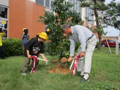 創校150周年記念事業の1つとして、ツバキの植樹を行いました。代表児童が土をかけたり、植樹に際しての思いを話したりしました。これから長い年月をかけて成長していく姿を見守っていきたいです。