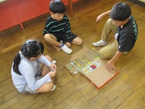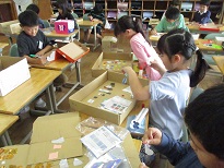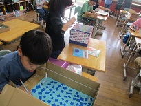 図工の学習では、桃太郎やつるの恩返しなどのお話を思い浮かべ、すごろくを作りました。箱に色紙を貼って海を表現したり、箱を重ねて山に登る様子を表現しました。授業の終わりには、友達が作ったすごろくで楽しく遊びました。