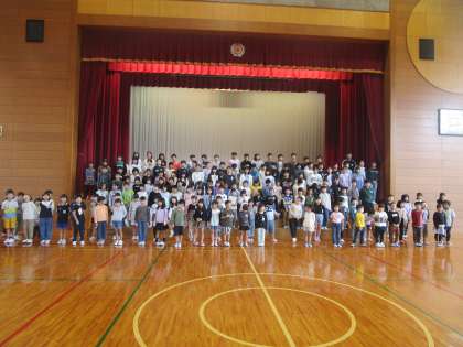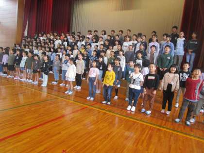 全校児童が集まって歌の練習をしました。自分のパートをしっかりと意識して歌声を響かせました。