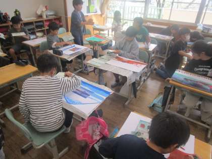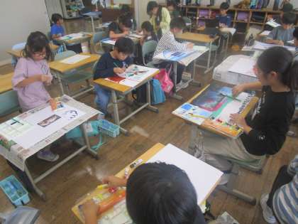 自分で選んだ写真を画用紙に貼り付け、自分の想像したことを絵や模様で表現しました。スポンジやブラシなど、多様な道具を活用していました。