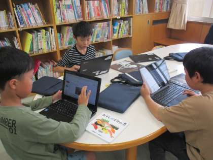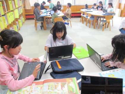 国語の時間に一年生におすすめの本を図書室に探しに行きました。一年生の立場になって絵本を選んでいました。