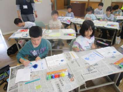 図画工作の時間に、初めて水彩絵の具を使って学習しました。準備や片付けの仕方、用具の名前を確かめたり、筆で線や形をかいたりしました。