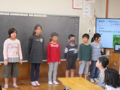 1年生は、3年生の本紹介を聞きました。3年生は、1年生が楽しんで読んでくれそうな本を選び、なぜ選んだのかや話の内容を教えてくれました。次に図書室に行ったときに、借りてみたい本がたくさん見つかりました。