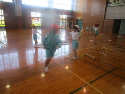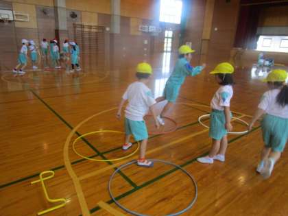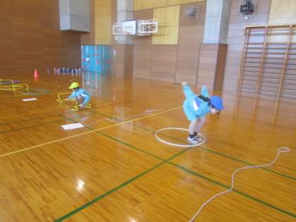 体育では、ミニハードルやフラフープ、大縄等を使って跳ぶ運動に取り組んできました。今日は、学習のまとめとして、グループでハードル等を好きなように並べてコース作りをしました。自分のグループや他のグループが作ったコースで、思いきりジャンプ遊びを楽しんでいました。