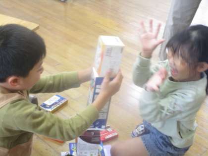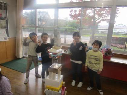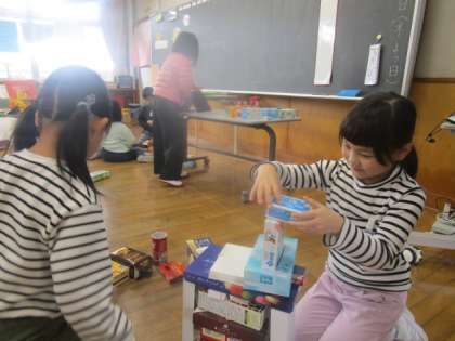 1年生は、算数でかたちあそびの学習をしました。グループの友達と持って来たはこの形を紹介しあったり、積んだり並べたりしました。たくさんのグループが高く積み上げていました。どうやったらより高く積めるか、はこの形に注目しながら楽しく試していました。