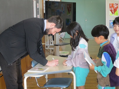 最後に、ALTにサインをもらい、大満足の子供たちでした。
