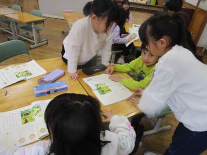 国語では、教科書のイラストを見て、自由にお話をつくり、友達に伝えました。友達からたくさんの質問をもらうことで、想像がさらに広がっている様子でした。