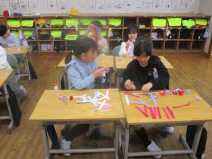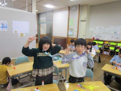 再来週に「2学期がんばったね&クリスマス集会」を開く予定です。それに向けて教室に飾るわっかの飾り作りをしました。目標はみんなの飾りをつなげて、教室をぐるっと1周できる長さにすることです。
