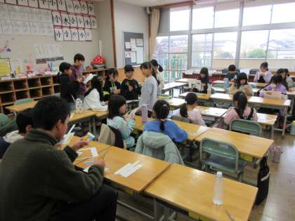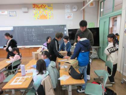 今回は、しおりと空気砲を作りました。しおり作りでは、自分の好きな図柄を選んで、たくさんのしおりを作りました。また、空気砲では、友達と協力しながら作り、玉である紙コップや紙皿をいい音を立てて遠くに飛ばしていました。子供たちは楽しんで取り組んでいました。