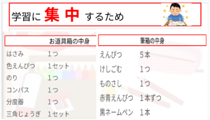 筆箱・お道具箱の中身を整頓しました。目的は「学習に集中する」ためです。画像にある通り必要なものを提示すると、数が足りなかったり、反対に多すぎたり、物がなかったりする子供の姿がありました。中身のチェック表は本日、お道具箱は今週中に持ち帰るので、ぜひご家庭でも親子一緒に中身の整頓や不足しているものの補充をしていただければと思います。
