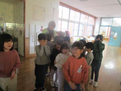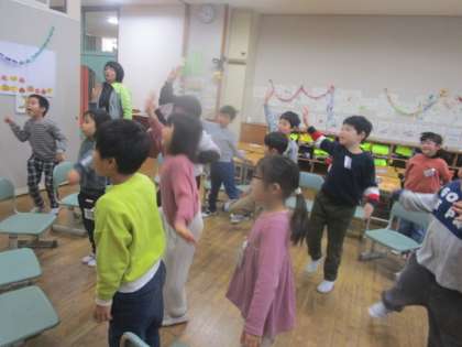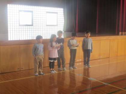 2学期も終わりに近付き、今日は「2学きがんばったね&クリスマス集会」を開きました。グループに分かれて、けいどろ、おばけやしき、劇、宝探しの出し物を発表しました。みんなが楽しんでくれるように工夫してあり、盛り上がっていました。最後にみんなで「ぼよよん行進曲」を笑顔いっぱいに踊りました。3学期もさらに仲良く、元気いっぱいに過ごしていきましょう。