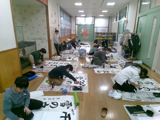昨日行われた書き初め大会。冬休みの練習の成果を発揮しようと、一生懸命書いていました。