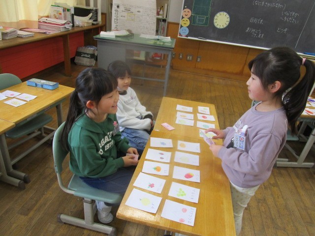 また、「ものの名まえ」の学習では、自分が決めたお店の品物の名前を集め、品物カードを作ってお店を開きました。どの店にも魅力的な品物が並び、大盛況でした。