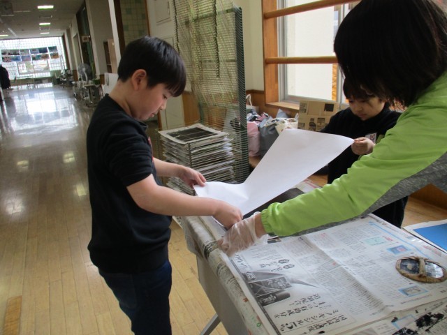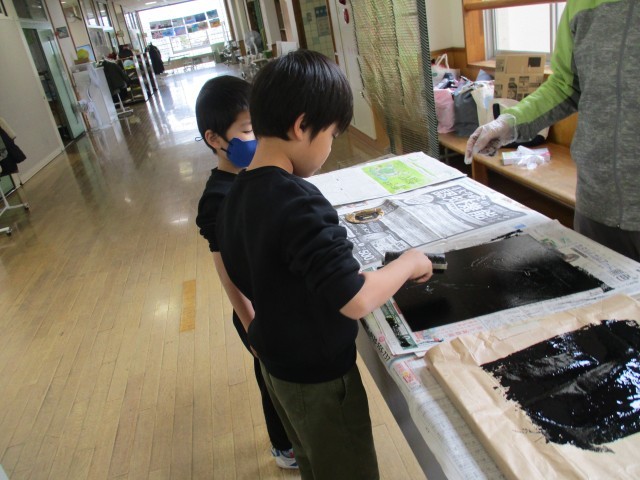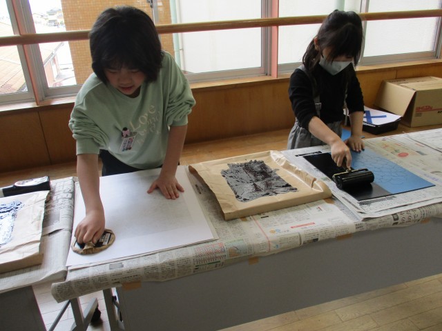 図画工作科の学習では版画制作に取り組んでいます。今日は刷る時間でした。友達と協力しながら作品を完成させていました。