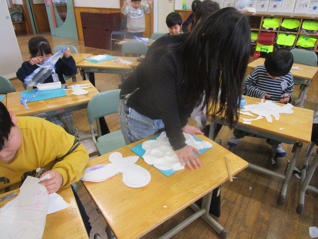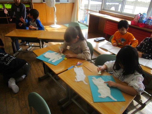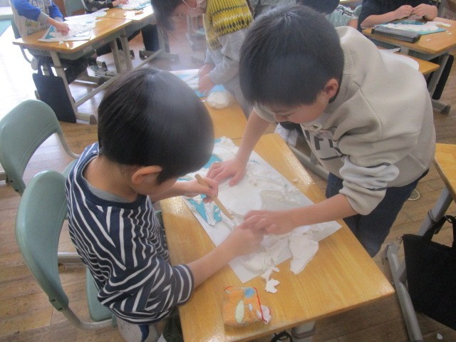 図工では、版画の学習をしています。今日は、紙粘土を広く伸ばして生き物の形に切り取りました。1年生にとって大変な作業もあったようですが、友達とも協力しながら、それぞれ素敵な模様の入った生き物に仕上げました。次は、インクを付けて、紙に写します。