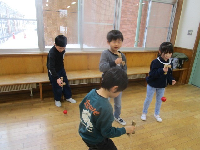 また、生活科では、昔の遊びに挑戦しています。こま、けん玉、お手玉の中から名人になりたい遊びを1つ選び、修行中です。様々な技に挑戦したり、一つの技を連続でできるように練習したりしていました。