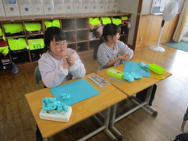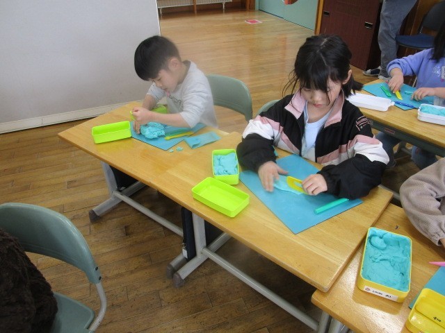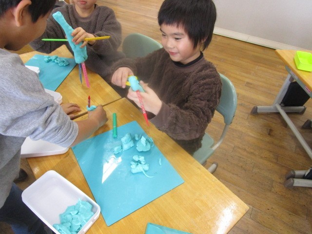 粘土を使って、自分が住みたい部屋や家の様子を表現しました。食べ物やゲームがたくさんある部屋、テレビやベッド、冷蔵庫等がそろっている部屋等、楽しく想像しながら作っていました。