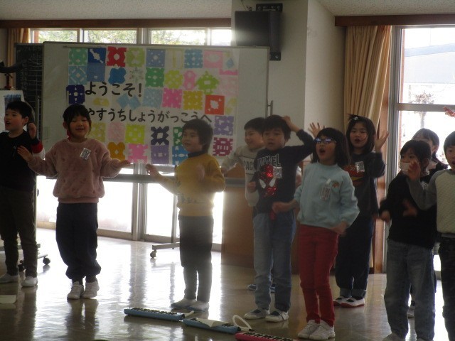 今日は、近隣の幼稚園、保育所の年長さんと1年生で交流会がありました。