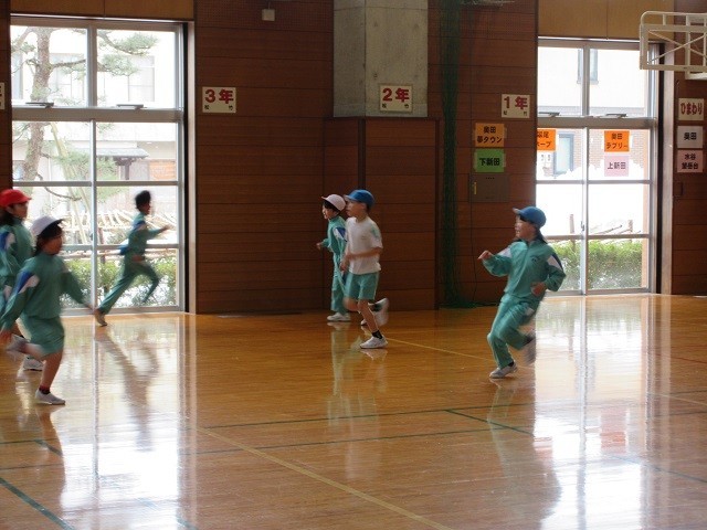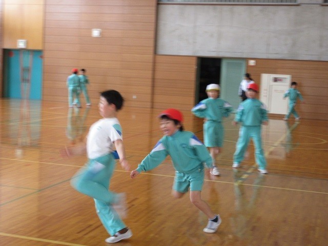 体育の時間、色帽子を使って、しっぽ取り鬼ごっこをしました。寒さに負けず、元気いっぱいに走る子供たちです。