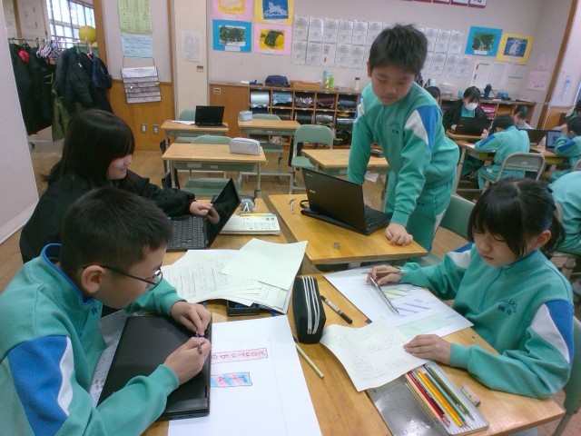 国語科の学習では、友達にアンケートしたりインタビューしたりしたことをもとに、どのようなことを考えることができるか、金曜日に発表する予定です。班ごとに資料を作ったり、発表練習をしたりしています。