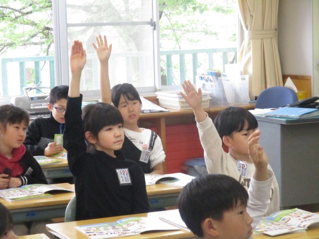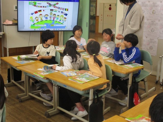 外国語の学習では、世界の国々について学習しています。元気よく歌を歌い、はりきって活動しています。
