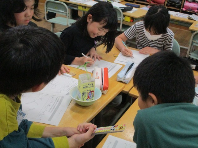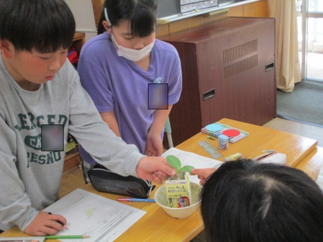 ヘチマの子葉と本葉をよく見て、大きさや形、手触りなども観察していました。