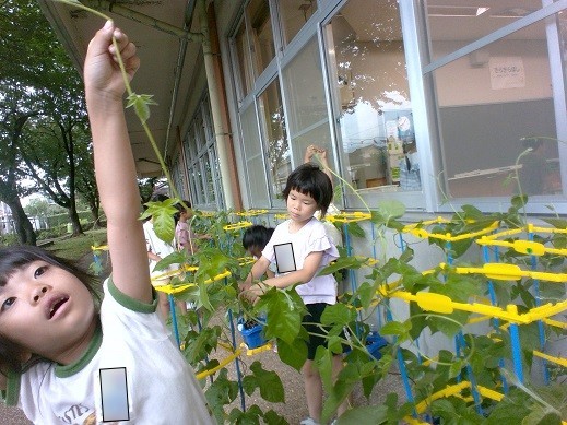 あさがおのつるがすくすくと成長しています。子供たちは、毎日背比べをしながらあさがおの成長を楽しみにしています。