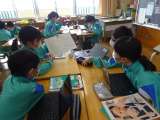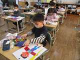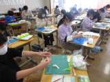 図画工作科では、ステンシル版画を製作中です。カッターで切った絵が完成すると、次...