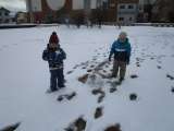 グラウンドに雪が少し積もったということで一年生みんなで雪遊びをしました。雪合戦...