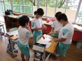 5月に植えた野菜の片付けを行いました。お互いに声をかけながら、茎から支柱を外し...