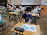 教科書についている形を2つの仲間に分ける学習をしました。角の数や直線の数に注目...