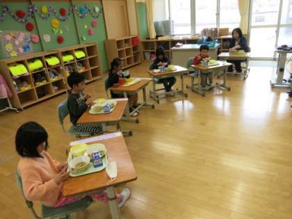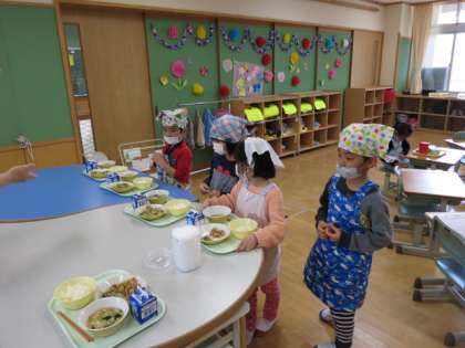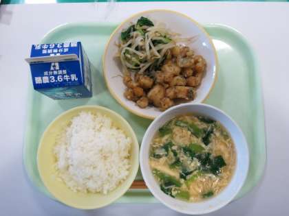今日の献立は、魚とまめのえごまみそからめ、おひたし、かきたま汁、です。