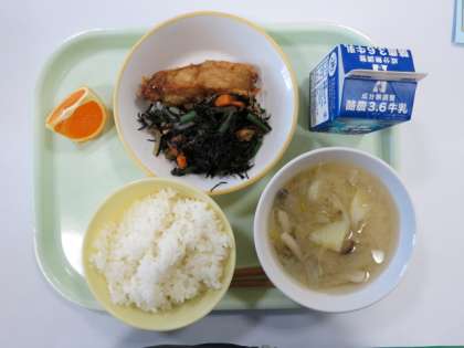 今日の献立は、魚のりきゅう揚げ、ひじきのいため煮、みそ汁、きよみオレンジ、です。