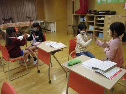「茶つみ」の音楽に合わせて、手遊びをしました。リズムよく手をたたいています。