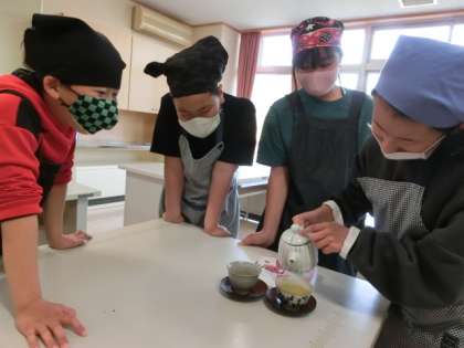 5年生は家庭科で、お茶の入れ方の実習をしました。おいしいお茶になるように、お茶の葉の量やお湯の熱さ、お湯を入れる順番などを確かめながら入れました。、