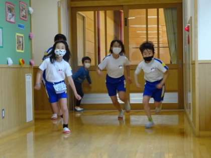 お昼休みは、ファミリーで遊びました。 だるまさんがころんだをしています。