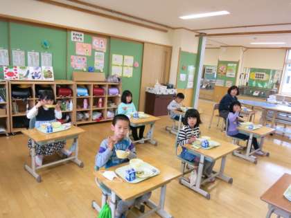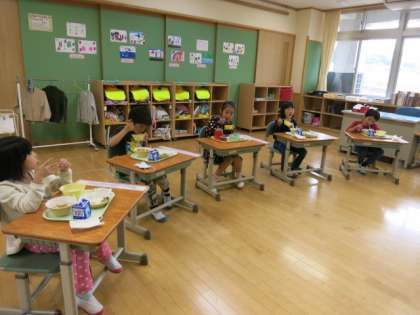 今日の献立は、えびパオツ、小松菜のごま和え、ホイコーロー、味付け小魚、です。