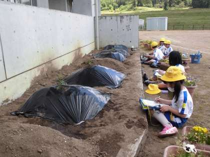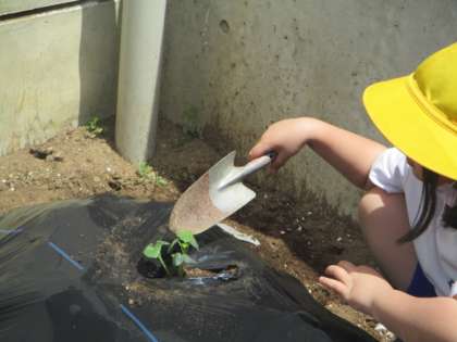 先週自分たちで作った畝に、自分の野菜を植えました。まだ、小さくてかわいい苗です。これから大きく育っていくのを楽しみにしながら植えました。