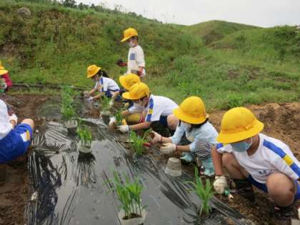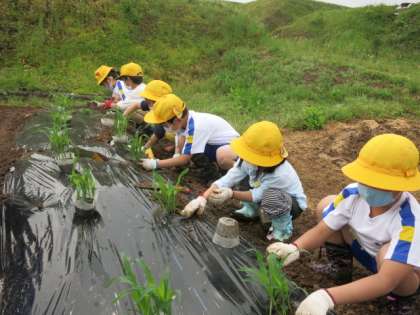 1・2年生は引き続いて、トウモロコシの苗を植えました。