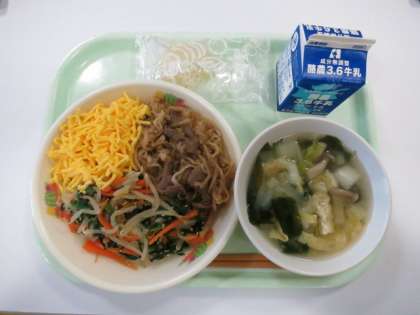 今日の献立は、ビビンバ(焼き肉、ナムル、きんしたまご)、みそ汁、冷凍ラフランス、です。