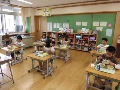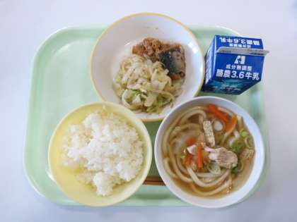 今日の献立は、かしわうどん、さばの銀紙焼き、あまず和え、です。